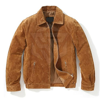 Yeni varış erkek yüksek kalite özel tasarım süet deri ceket en iyi kış ceket standı yaka ön Logo inek derisi deri